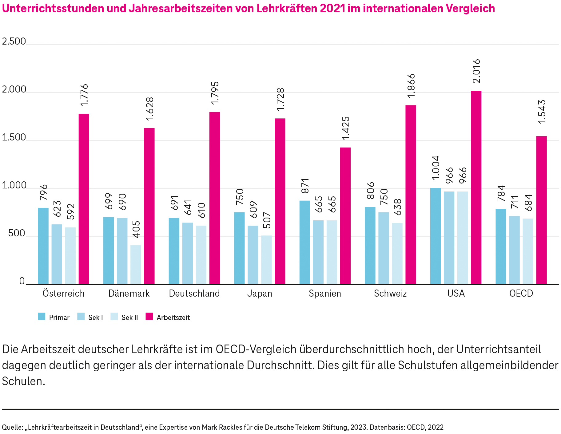 Auch im internationalen Vergleich ist das deutsche Deputatsmodell, wie Rackles zeigt, ein Unikum – und es sorgt dafür, dass deutsche Lehrkräfte vergleichsweise viel arbeiten, dabei aber deutlich weniger zu ihrer Kernaufgabe, dem Unterrichten, kommen.